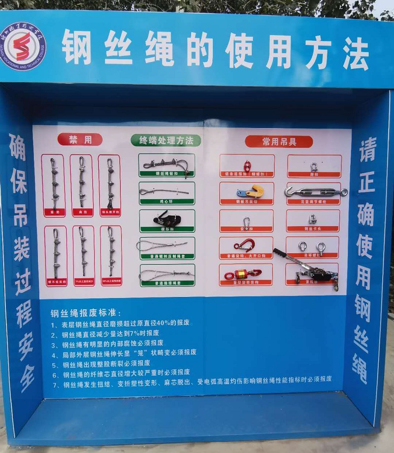 2、采用鍍鋅鋼構架,展示鋼絲繩的正確處理方式和禁用方式。配搭鋼絲繩的一些報廢標準。